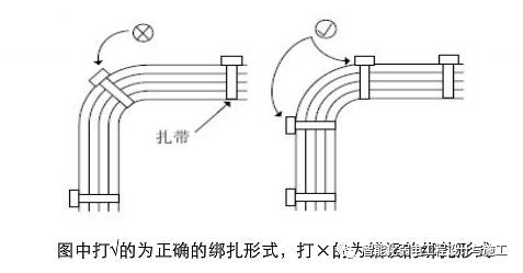 绑扎成束的电缆转弯时,扎带应扎在转角两侧,以避免在电缆转弯处用力过大造成断芯的故障。